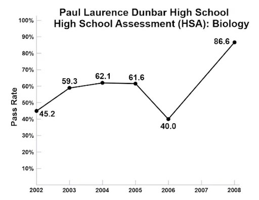 I developed my teaching methodology in my career as a neurologist at the University of Alabama and University of Maryland Medical Schools teaching over 2500 medical students and residents. In 2007, I put my teaching methodology to the test by teaching biology1 hour a week to the entire junior class (97 students) at Dunbar High School in Baltimore, Maryland. That year, the pass rate on the statewide, standardized HSA exams (for which passing was a requirement for high school graduation) rose from 40% the year before I taught to 87% the year I taught. (See the graph below.)